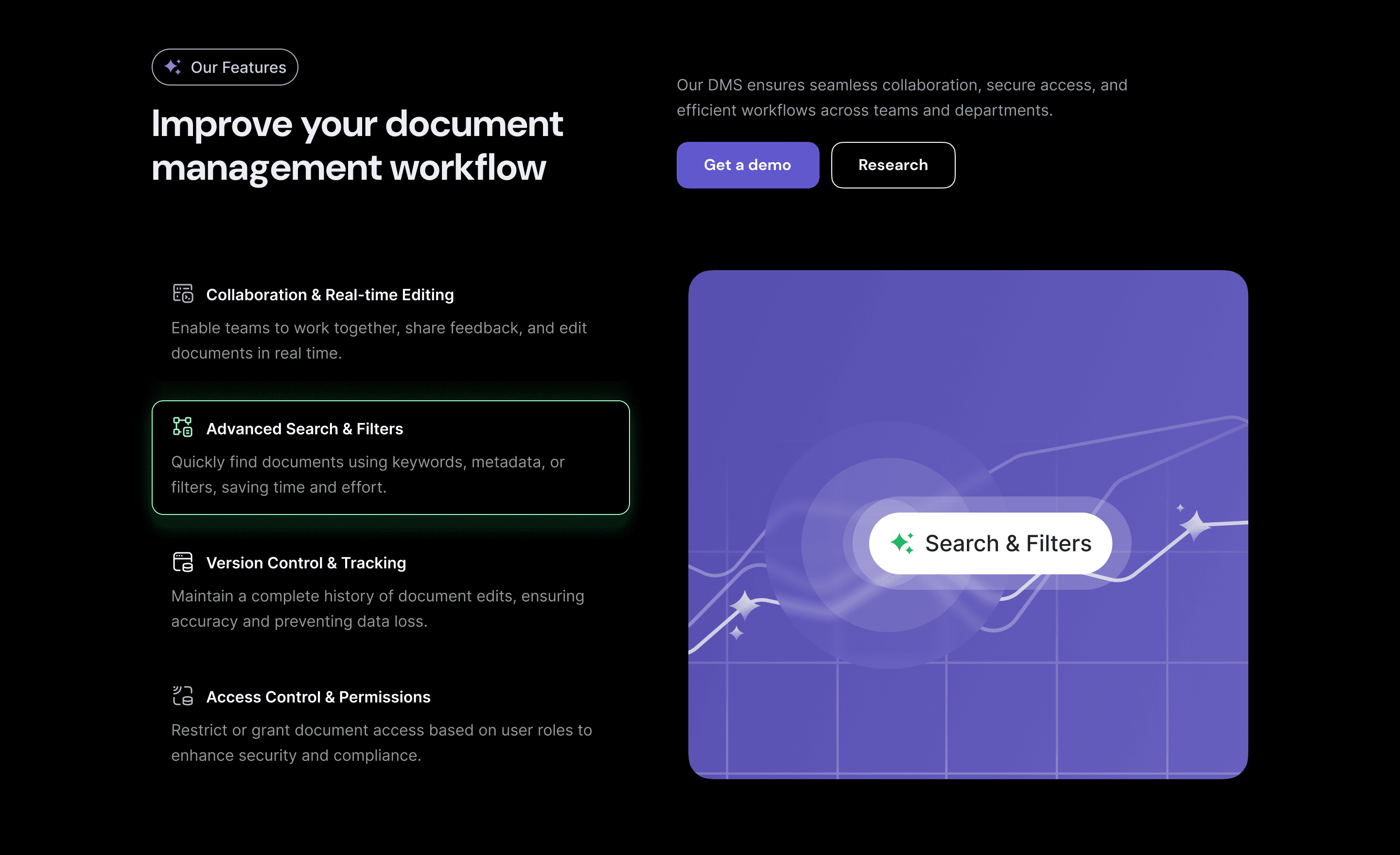 Search & Filters: AI-based document search with advanced filters (owner, date, category)