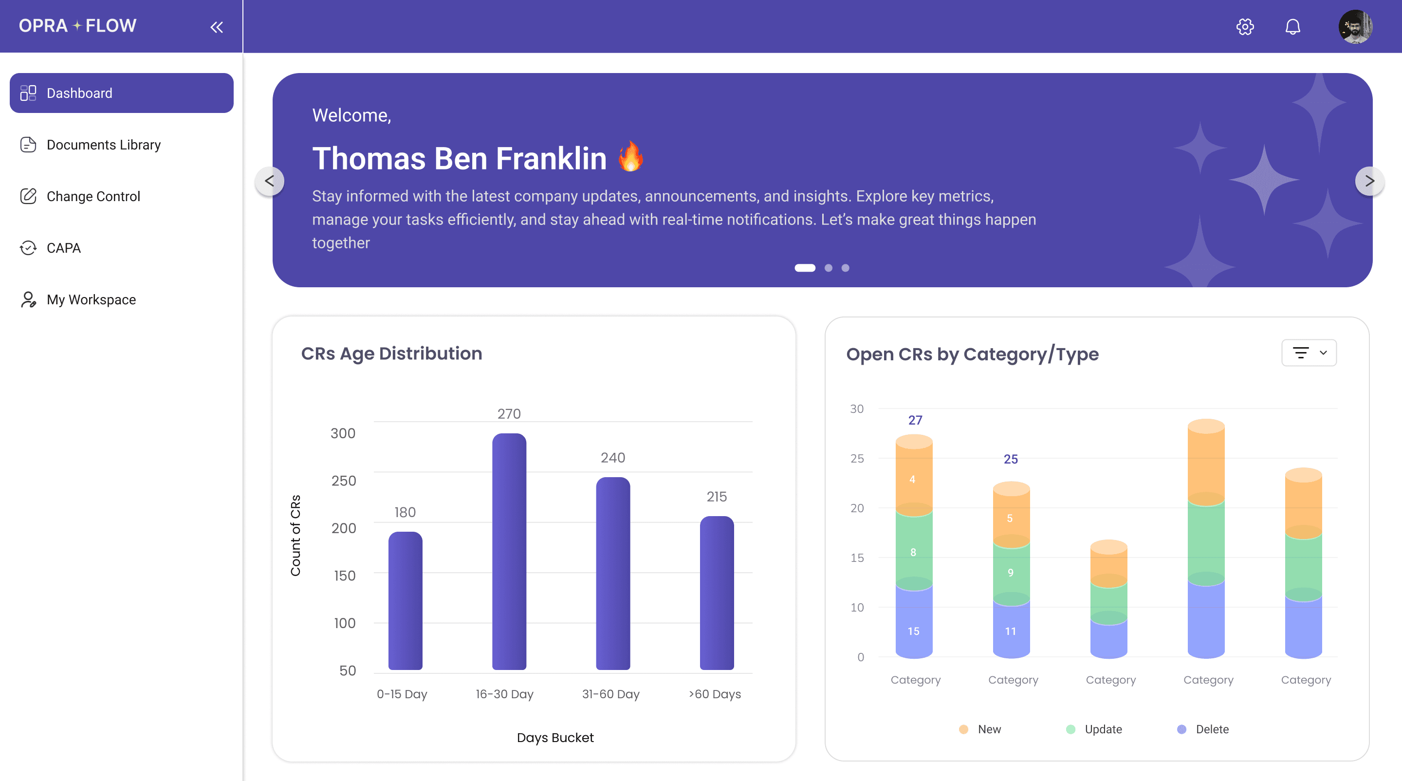 Dynamic Dashboard: Displays total documents, pending edits, CAPA alerts, and role summaries